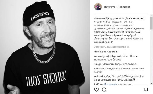 Оказывается, что уже 19 октября в Петербурге пройдет очередной концерт группировки, и случится это на «Зенит-Арене». Концерт станет первым официальным массовым мероприятием на стадионе. Раньше там проходили только спортивные матчи. Шнур и его коллеги планируют собрать 60 тысяч человек. «Да, друзья мои. Даже немножко страшно. Все предварительные договорённости воплотились в договоры, дата и место подтверждены и скреплены подписями и печатями. 19 октября! Зенит-Арена! Петербург! Ленинград! 60 тысяч зрителей! Идём на рекорд! Ура!», — написал лидер коллектива. К слову, на своем прошлом концерте в «Олимпийском» «Ленинград» собрал 45 тысяч человек, а на стадионе «Открытие» — 50.