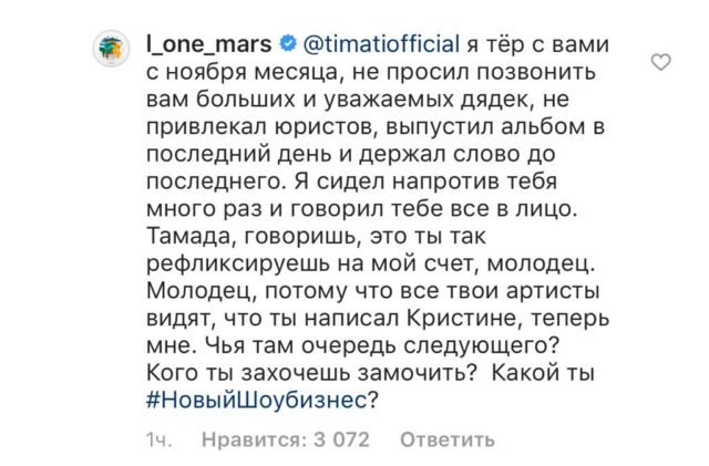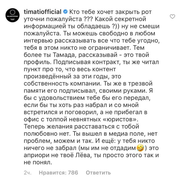И ответа ждать долго не пришлось! Тимати (35) прокомментировал пост L’One: «Кто тебе хочет закрыть рот уточни пожалуйста ??? Какой секретной информацией ты обладаешь ?)) ну не смеши пожалуйста. Ты можешь свободно в любом интервью рассказывать все что тебе угодно, тебя в этом никто не ограничивает. Тем более ты Тамада, рассказывай — это твой профиль. Подписывая контракт, ты же читал пункт про то, что весь контент произведённый за эти годы, это собственность компании. Ты же в трезвой памяти его подписывал, своими руками. Я бы с удовольствием тебе бы его передал, если бы ты хоть раз набрал и со мной встретился и поговорил, а не прибегал в офис с толпой невнятных «юристов». Теперь желания расставаться с тобой полюбовно нет. Ты вышел в медиа поле, нет проблем, можем и так. И ещё: у тебя никто ничего не забрал (мы им не отдадим) это априори не твоё Лёва, ты просто этого так и не понял». А в следующем сообщении добавил: «Кроме тебя и Крис (Кристина Си, которая после ухода из лейбла тоже заявила, что имя у нее забрали незаконно — прим. ред.) ни с кем проблем не было. Все нормально вышли каждый по своему».