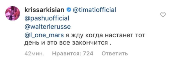 И сама Кристина Си (28), которую упоминали аристы, в скандал тоже вмешалась! В комментариях под постом Левана она отметила Тимати, генерального директора Black Star Пашу (35) и директора лейбла Вальтера Леруссе и написала: «Я жду когда настанет тот день и это все закончится».