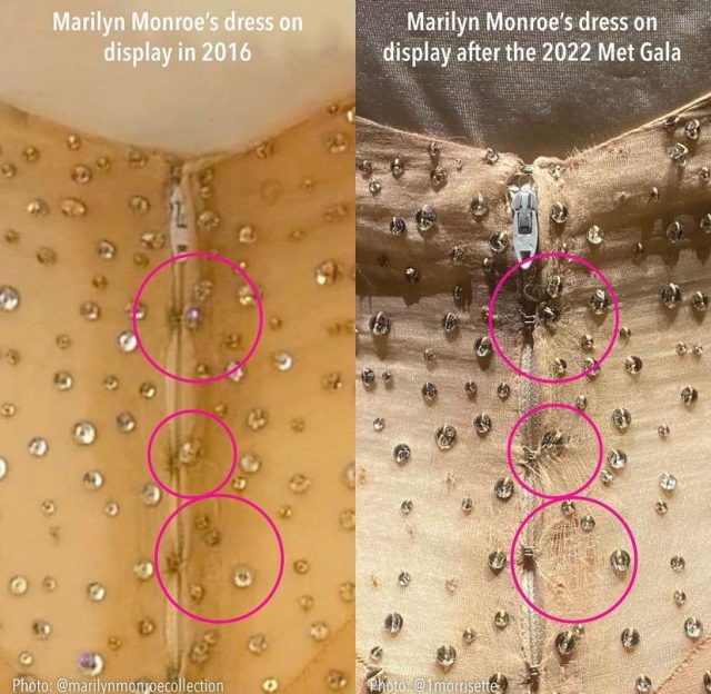 А сейчас на горизонте разгорелся новый скандал. В Сети появились фотографии, опубликованные коллекционером Скоттом Фортнером, на которых видно, что платье заметно повредилось, после того, как Ким надела его. Вдоль задней застежки появились прорехи, а несколько страз и пайеток и вовсе отвалились. Для сравнения были представлены снимки платья 2016 года.