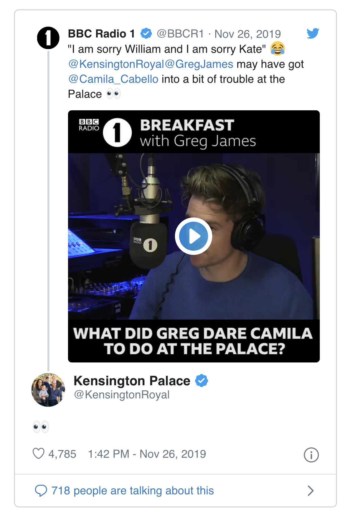 "I am sorry William and I am sorry Kate" ? @KensingtonRoyal@GregJames may have got @Camila_Cabello into a bit of trouble at the Palace ? pic.twitter.com/aKArMdD04H