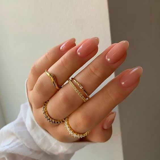 Маникюр имитирует мягкое, блестящее, немного розоватое покрытие, как у блеска для губ. Поэтому то, что тебе нужно, — это легкий, прозрачный слой лака с глянцевым покрытием и стойким блеском.