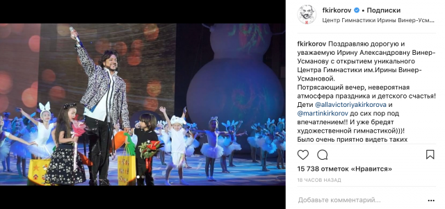 «Поздравляю дорогую и уважаемую Ирину Александровну Винер-Усманову с открытием уникального «Центра гимнастики имени Ирины Винер-Усмановой». Потрясающий вечер, невероятная атмосфера праздника и детского счастья! Дети до сих пор под впечатлением и уже бредят художественной гимнастикой», – написал он в Instagram.