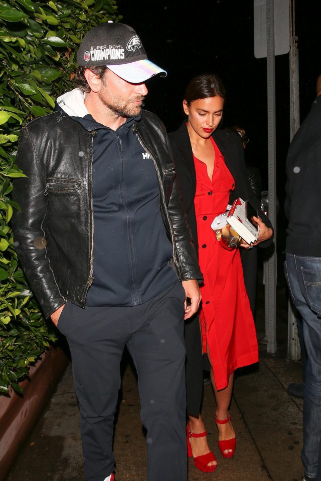 Шейк, кстати, выглядела прекрасно. Для выхода модель выбрала платье ярко-красного цвета, подобрав помаду в тон. А вот Брэдли был «на спорте»: в костюме, кожанке и кепке.