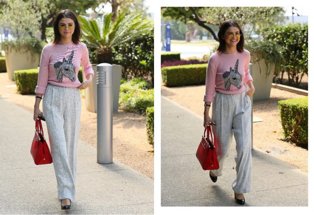 Но вчера Селена удивила нас: она гуляла по Лос-Анджелесу в свитере, классических широких брюках и на каблуках. На свитере от Coach (Селена сотрудничает с брендом с декабря прошлого года) был вышит единорог. Его она надела с чёрными туфлями Christian Louboutin, жёлтыми узкими очками Oliver Peoples и сумкой, дизайн которой разработала сама. Это была красная Coach x Selena Gomes, бренд представил ее в начале этого месяца, сумка оценивается в 395$.