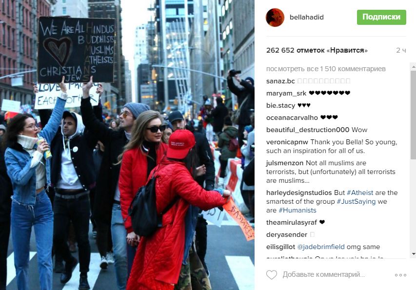 На участие в митинге Джиджи и ее сестру вдохновил Марш женщин 21-го января (на следующий день после инаугурации), когда на улицы сразу нескольких городов вышли тысячи феминисток – они считают, что миллиардер Дональд Трамп (70) будет ущемлять права женщин. К простым гражданам тогда присоединились и мировые звезды – в толпе заметили Кэти Перри (32), Майли Сайрус (24), Мадонну (58), Скарлетт Йоханссон (32) и других знаменитостей. По приблизительным подсчетам, число демонстрантов только в Вашингтоне превысило 500 тысяч! Аналогичные марши прошли в Бостоне (175 тысяч), Чикаго (250 тысяч), Лос-Анджелесе (750 тысяч).