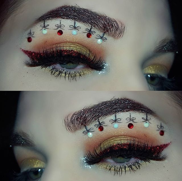 Мы уже рассказывали, как можно украсить брови к Новому году. Но, как оказалось, есть еще более странный вариант декора, и придумала его инстаграм-визажист под ником bronya_h. Она предлагает украшать брови елочными шарами — не в буквальном смысле, конечно (хотя от блогеров можно ждать чего угодно), а использовать стразы. Клеить блестящие украшения нужно под бровь, после чего прорисовать ленточки, чтобы в итоге получилось подобие еловой ветки с шарами.