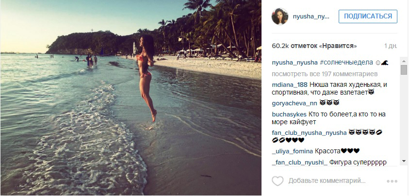 Девушка выложила в Instagram фотографию, на которой запечатлено, как Нюша отдыхает на побережье в раздельном купальном костюме. Потрясающую фигуру певицы моментально оценили поклонники и принялись заваливать ее хвалебными комментариями.