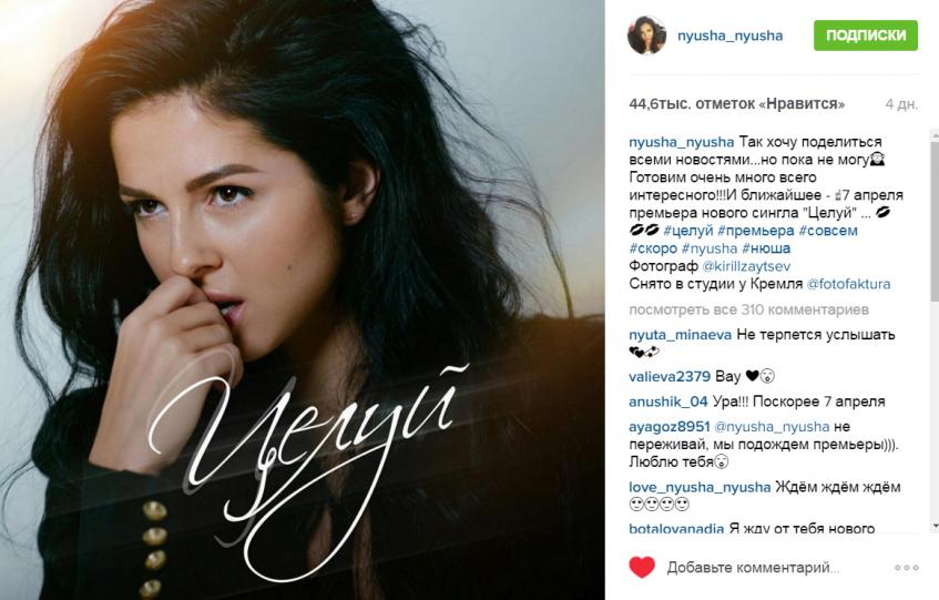 Этой радостной новостью Нюша поделилась со своими подписчиками в Instagram, опубликовав снимок, на котором она смотрит куда-то вдаль. «Наконец-то мой новый сингл «ЦЕЛУЙ» доступен для скачивания в iTunes», — оставила подпись исполнительница.