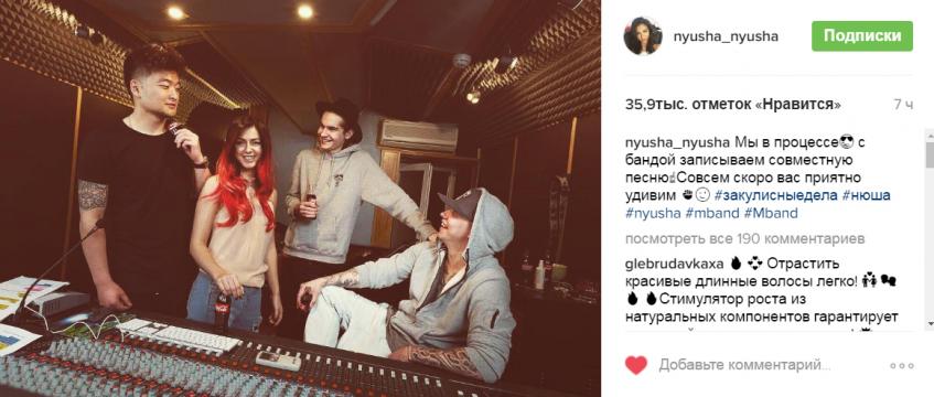 Об этом сообщила своим поклонникам сама Нюша, опубликовав в Instagram снимок из студии, на котором певица запечатлена со всем составом MBAND. «Мы в процессе. С бандой записываем совместную песню! Совсем скоро вас приятно удивим», — подписала фото Нюша.