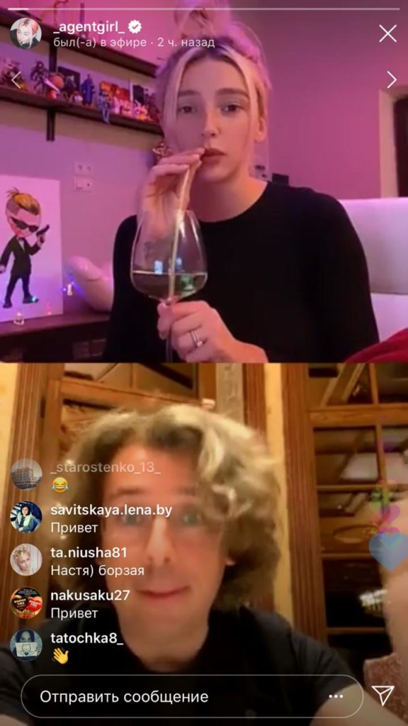 Ну после советов и обсуждения занятий на карантине артисты перешли к мини-интервью, задав (под вино) друг другу по пять вопросов. Кстати, в эфир заглянула и Алла Борисовна с детьми, а вот Элджей, несмотря на ожидания публики, так и не появился в кадре (Настя попросила его принести еще вина, но он «занимался английским»).