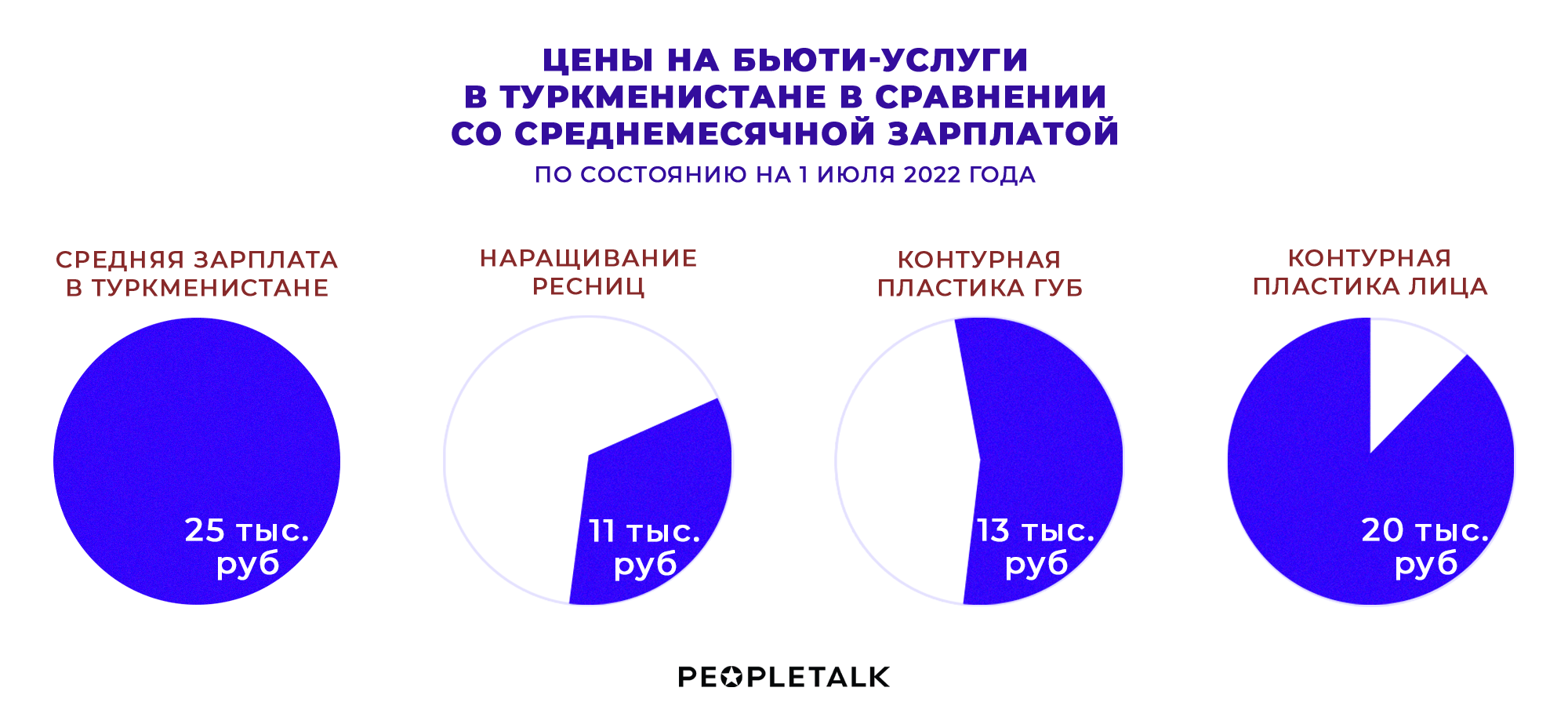 В первую очередь это очень прибыльный бизнес, поэтому закрыться полностью он не смог бы. Если посмотреть на средние расценки за бьюти-процедуры, можно увидеть, что их стоимость в лучшем случае сопоставима с половиной среднемесячной зарплаты, которая в столице Туркменистана составляет 1500 манат (около 25 тыс. рублей). Для сравнения в Москве на ту же контурную пластику губ ты потратишь примерно одну седьмую своего ежемесячного заработка (который, по официальным данным Росстата, составляет 146 тыс. рублей).