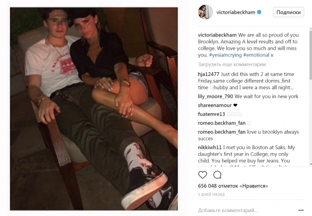 Недавно Виктория Бекхэм (43) растрогала подписчиков постом в своем Instagram – сообщила, что ее старший сын Бруклин (18) поступил в колледж: «Мы так тобой гордимся, Бруклин. Прекрасные результаты экзаменов и поступление в колледж. Мы так сильно тебя любим и будем очень скучать».