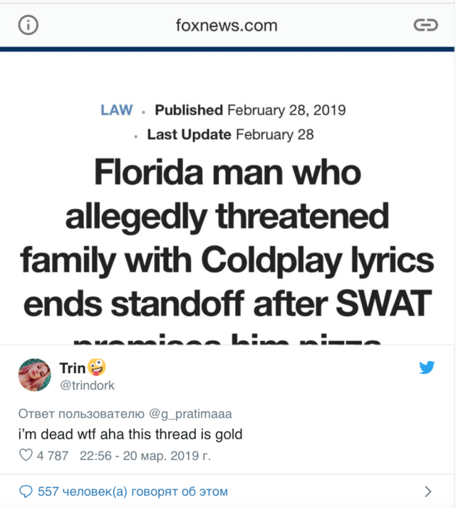 А сейчас в Twitter придумали флешмоб с этим мемом! Его запустил пользователь с ником @g_pratimaaa, который описал правила: «Все гуглим «мужчина из Флориды» вместе с датой своего рождения (например, мужчина из Флориды 22 августа) и говорим, что получилось. У меня — «Мужчина из Флориды попытался атаковать соседа трактором»». И в соцсети его поддержали!