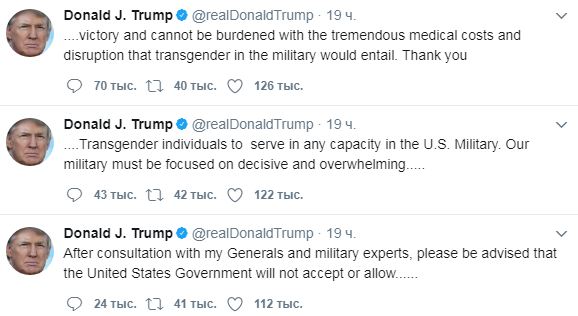 Теперь он заявил: трансгендеры не имеют права служить в американской армии. ««Наши военные должны сосредоточиться на решительной и ошеломительной победе,они не должны быть обременены огромными затратами на медицину и сбоями, вызванными службой трансгендеров в армии. Спасибо», — написал Трамп.