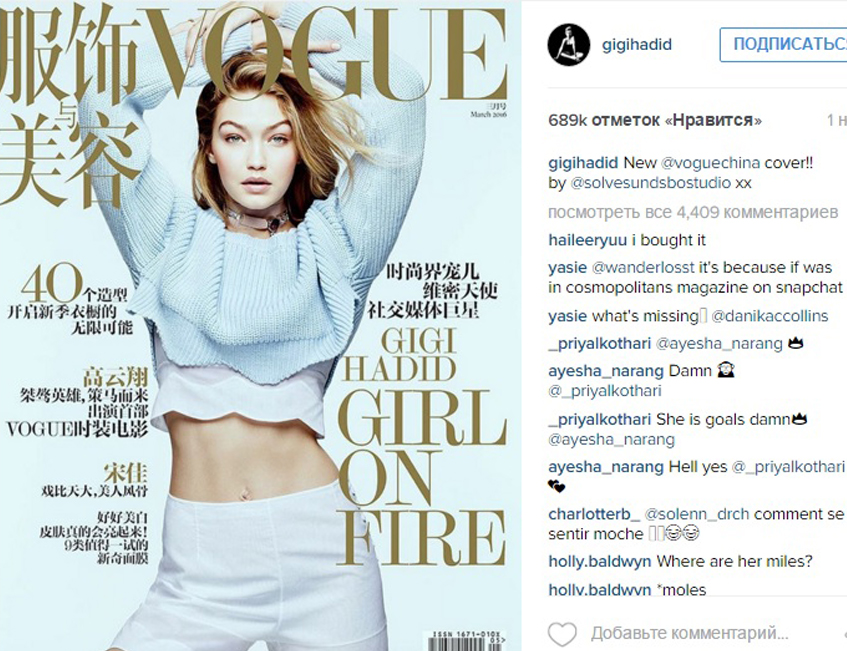 Кстати, это не первый фотошоп-скандал. Например, в 2016 китайский Vogue отбелил кожу Джиджи Хадид (21) и удалил ее родинки.