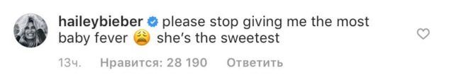 Под постом Дженнер, конечно, тут же появились тысячи комментариев с умилениями. Не осталась в стороне и Хейли Бибер, которая написала: «Пожалуйста, хватит возбуждать во мне материнский инстинкт! Она самая сладкая». Комментарий Хейли тут же собрал 28 тысяч лайков, и теперь фанаты пары надеются, что Джастин и Хейли в скором времени задумаются о ребенке.