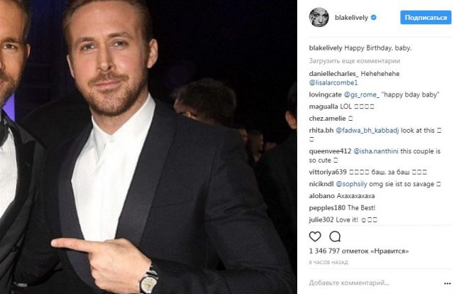 Теперь черёд Лайвли оригинально поздравлять мужа. 23 октября Рейнольдсу исполнился 41 год, и Блейк в стороне не осталась. К радости своих поклонников, она выложила фото Райана с его другом, актёром Райаном Гослингом (36). Мужа она оттуда вырезала, подписав фото: «С днем рождения, малыш». Аплодисменты для Блейк!