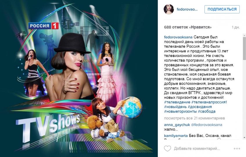 В 2002 году обладательница титула «Мисс Вселенная-2002» Оксана Федорова (37) стала ведущей программы «Спокойной ночи, малыши!» на телеканале «Россия». После этого девушка с успехом принимала участие во множестве других проектов ВГТРК. Но звезда объявила о своем уходе с телеканала.