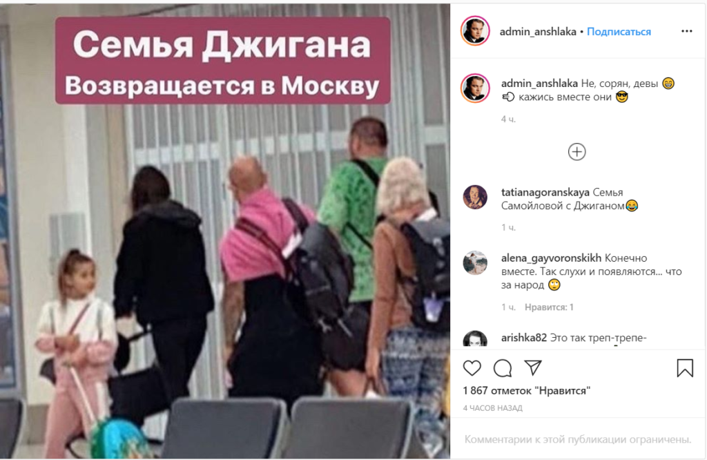 И вот, сегодня Джигана и Оксану Самойлову заметили вместе в аэропорту в Майами. Очевидцы сфотографировали супругов, когда они вместе с детьми (у пары их 4) сдавали багаж и проходили паспортный контроль. А это значит, звездная чета возвращается домой в Москву. Будем следить за развитием событий.