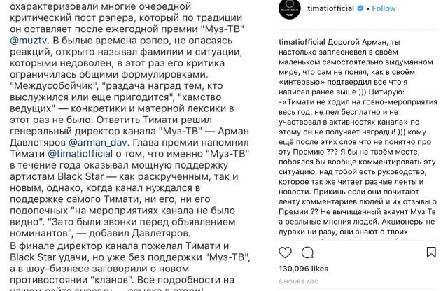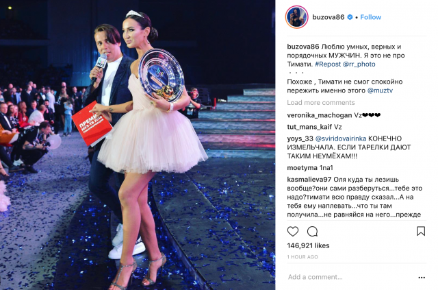 Ольга Бузова (32) решила в стороне не оставаться и заступилась за любимую премию. Певица написала в Instagram: «Люблю умных, верных и порядочных мужчин. Это я не про Тимати. Похоже, Тимати не смог пережить именно это». И отметила «МУЗ-ТВ».