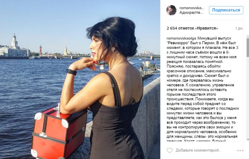 Увидев реакцию ведущей, некоторые зрители обвинили ее в мягкотелости и слабости. Но девушка решила дать отпор обидчикам и ответила им большим заявлением в Instagram. Она написала: «Минувший выпуск «Ревизорро» был о Перми. В нем был момент, в котором я плакала. Не все три с лишним часа съемок вошли в восьмиминутный сюжет, потому не всем моя реакция показалась понятной. Поясню, стараясь обойти красочное описание, максимально кратко и доходчиво. Сюжет был о номере, где прервалась жизнь человека. К сожалению, управление отеля не постеснялось оставить горькие последствия этого происшествия. Понимаете, когда вы видите перед собой предмет со следами, которые говорят о последних минутах жизни человека, и представляете, как это было (а у меня все проходит через воображение), то вы не контролируете свои эмоции, и для нормального человека, особенно для женщины, слезы — это нормальная реакция. Хохот, ужимки, бурный всплеск эмоций… Вам все это может показаться игрой, но я такая. Мои близкие и друзья это знают. Я могу вспылить и полезть в драку, могу размякнуть и расплакаться. И тут я тоже настоящая. Быть может, мне и стоит иногда сдерживать себя… И в своей работе я это делаю очень часто. Нравлюсь я вам или нет, это, безусловно, ваше дело. Одно могу сказать точно: я такая, какая есть, без наигранных спектаклей».