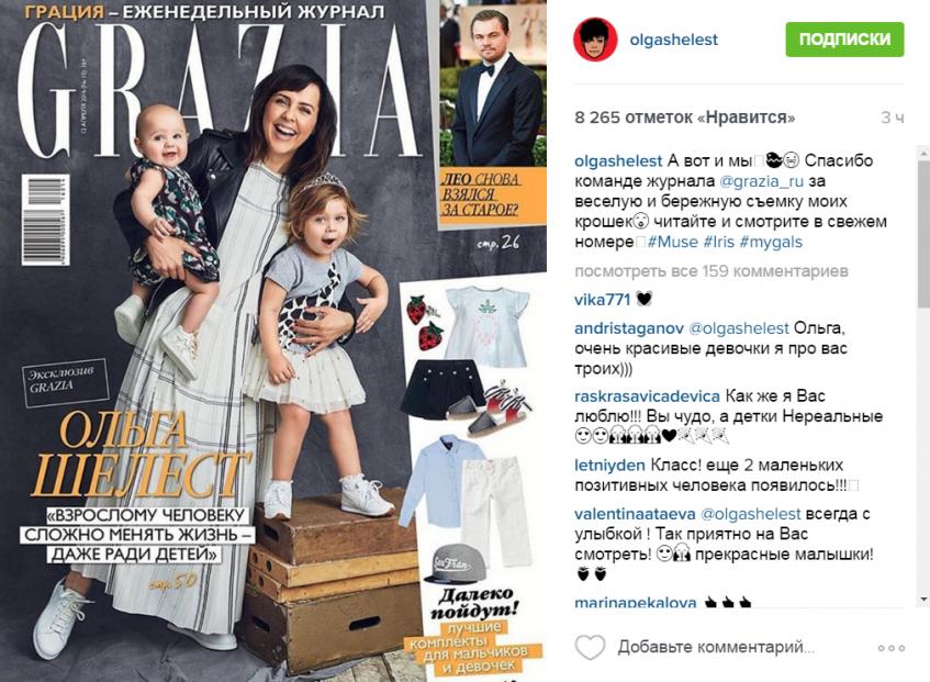 Сегодня Ольга опубликовала в своем Instagram обложку нового номера журнала Grazia, героиней которого она стала. Кроме самой ведущей на снимке также появились две ее дочурки — Муза и Айрис. Причем младшую звезда решилась показать широкой публике впервые. «А вот и мы! Спасибо команде журнала Grazia за веселую и бережную съемку моих крошек», — написала Ольга под снимком, который всего за три часа собрал почти 10 тыс. лайков.