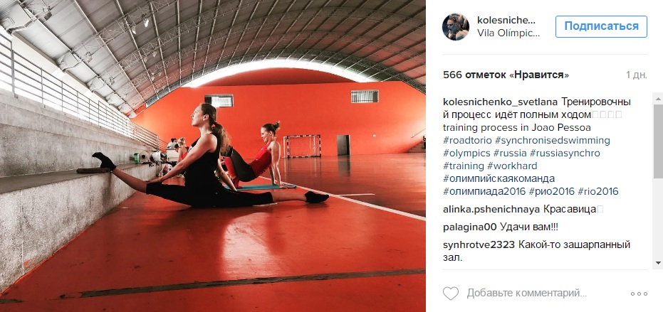 А вот, например, Светлана Колесниченко выложила снимок из зала, который предназначен скорее для игры в мини-футбол, а не для разминки сборной по синхронному плаванию: «Тренировочный процесс идёт полным ходом», — подписала девушка.