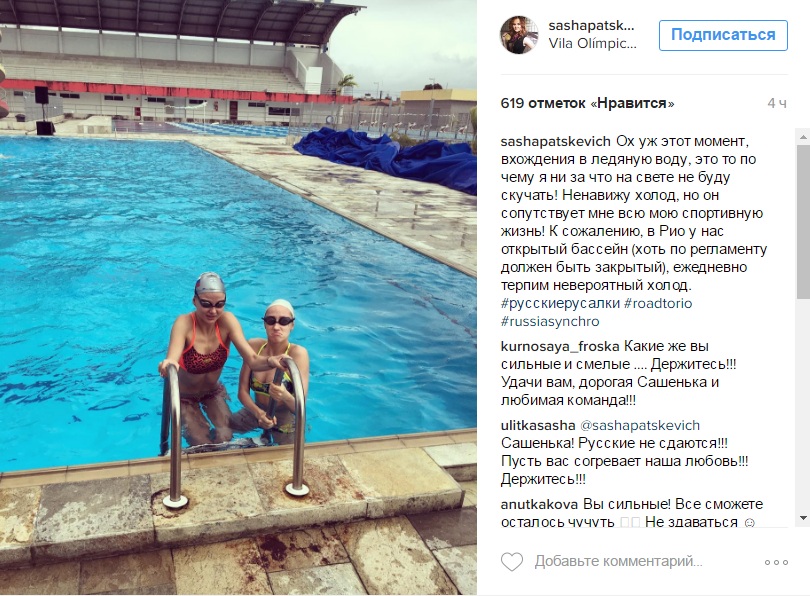 Одна из них – Саша Пацкевич – опубликовала фото в бассейне и подписала: «К сожалению, в Рио у нас открытый бассейн (хоть по регламенту должен быть закрытый), ежедневно терпим невероятный холод».