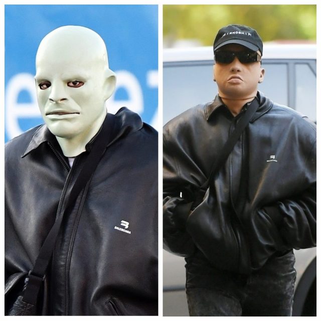 Какой все-таки Канье Уэст хитрец. Только посмотрите, какой он придумал способ запутать след папарацци. Канье, всему тебя учить надо. Ну кто так прячется от фотографов? Может быть вездесущие репортеры и не догадались бы, кто так неспешно идет по улице руки в боки. Но куртка и барсетка сдали своего хозяина с потрохами. Рэпер обожает этот кожаный бомбер Balenciaga и вот уже, кажется, неделю его не снимает. При этом он появлялся в нем и без маски, поэтому папарацци без труда вычислили горе-маскировщика.