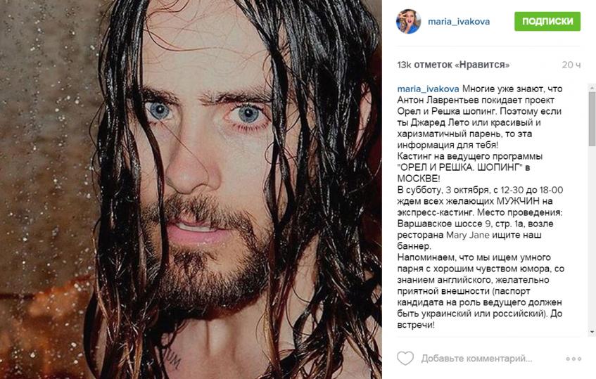 Об этом рассказала в Instagram Мария. Опубликовав фото Джареда Лето (43), ведущая написала: «Многие уже знают, что Антон Лаврентьев покидает проект Орел и Решка шопинг. Поэтому если ты Джаред Лето или красивый и харизматичный парень, то эта информация для тебя! Кастинг на ведущего программы "ОРЕЛ И РЕШКА. ШОПИНГ" в МОСКВЕ!»