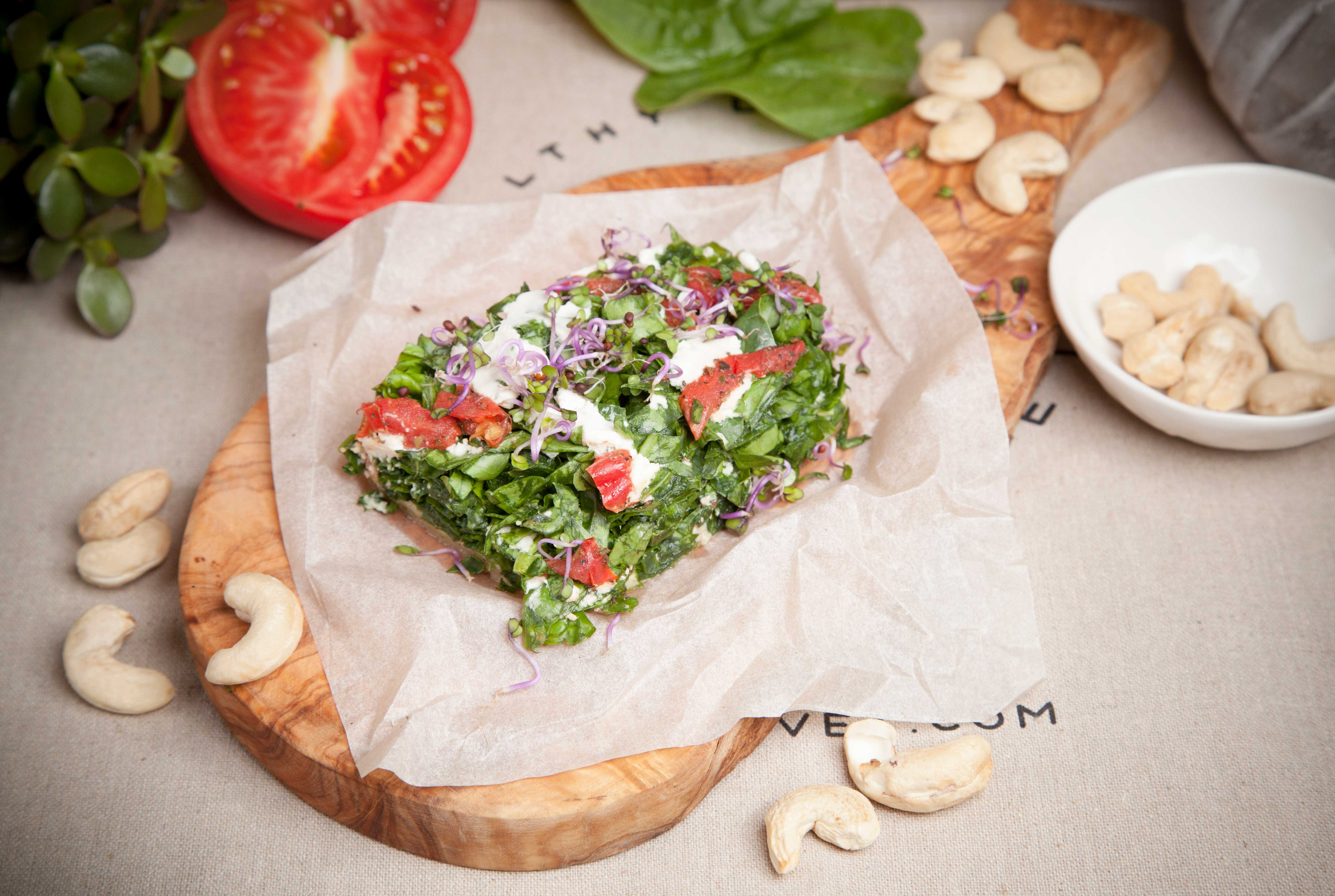 Взбить кешью и зеленую гречку блендере в муку, затем добавить воду и вымесить тесто. Положить в прямоугольную разъемную форму, предварительно застелив ее пленкой, разровнять и придавить. Потом нарезать шпинат без стеблей, добавить сок половины лимона, перемешать и слегка пожать руками. Выложить его на корж ровным слоем. Полить сверху соусом дзадзики (он сделан на основе кешью и семечек подсолнуха с зеленью и специями). И поверх соуса − вяленые томаты (для украшения). Можно еще кедровые орешки (для украшения).
