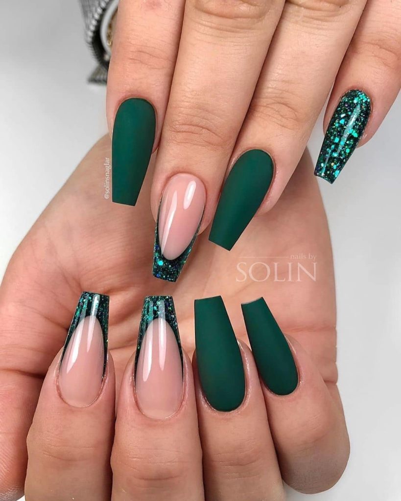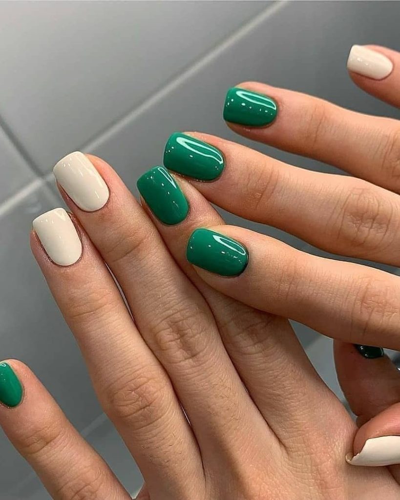 Яркий зеленый продолжает быть лидером по маникюрным заказам, только теперь начинает понемногу «линять». С приходом холодов все актуальнее будут становится оттенки, близкие к болотному и хаки. Впрочем, и цвет свежего газона будет смотреться уместно (если еще тебе не надоел).