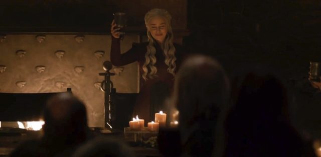 Дейенерис произносит тост за Арью Старк, но главной героини битвы на вечере нет — этого, правда, почти никто не замечает.