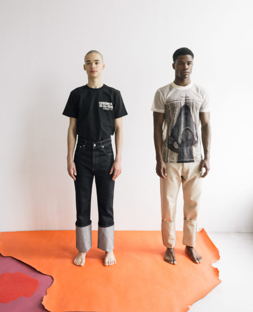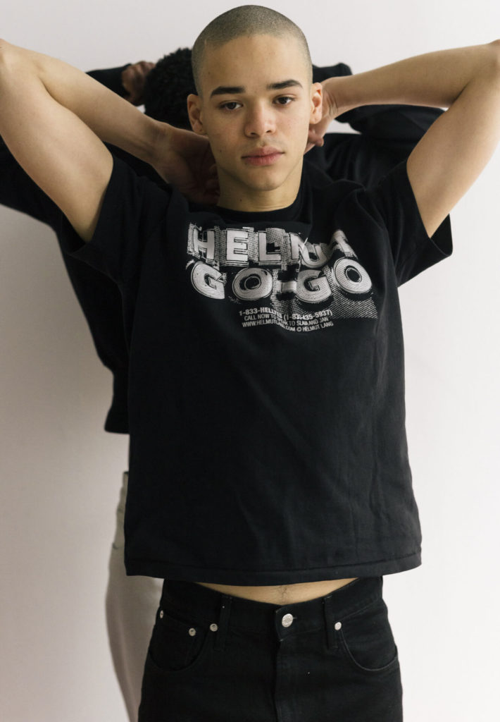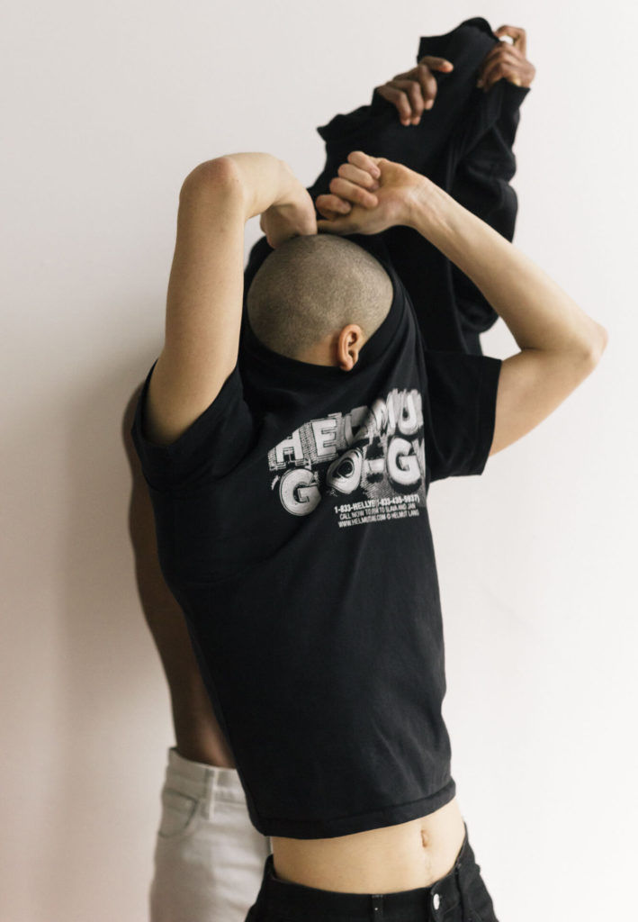 В 2019 году австрийский бренд предложил русскому квир-художнику Славе Могутину поработать над весенне-летней коллекцией. В рамках сотрудничества он создал для Helmut Lang лого-принты со слоганами Helmut Go-Go и Stock Boyz, которые напечатали на свитшотах и футболках. Но самое интересное не это. На всех вещах из коллекции указан номер телефона, позвонив по которому можно услышать голос художника.