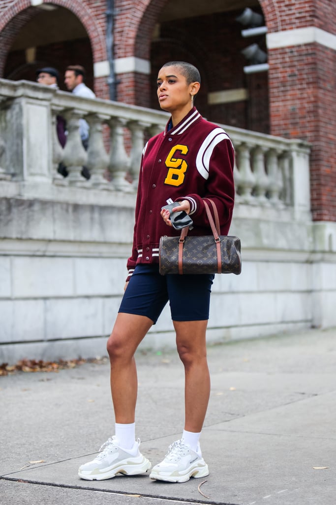 Но среди двубортных тренчей, трикотажных жилетов и полупрозрачных платьев мы выделили два образа, которые точно не останутся без внимания. Первый нам продемонстрировала королева школы Жюльен. Университетский бомбер, велосипедки и массивные кроссовки – и вот идеальный аутфит на эту осень готов.