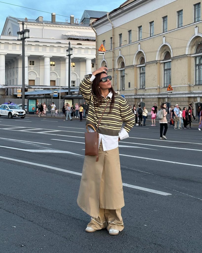 И, конечно, куда без Марии Червоткиной, которая славится своим взглядом на тенденции под пятым углом. Модный блогер решила по-новому обыграть актуальный прием стилизации юбки с брюками и вышла из ситуации победителем – образ на манер стиля преппи смотрится крайне органично. Впрочем, то же самое можно сказать и о наряде Кати Дармы – однозначно забираем идею для вечерней стилизации дюрага, классического головного убора из арсеналов рэперов, в категорию «на заметку». Помнится, свадебный образ инфлюенсера точно так же не обошелся без подобного нетривиального аксессуара. Только белого, разумеется.
