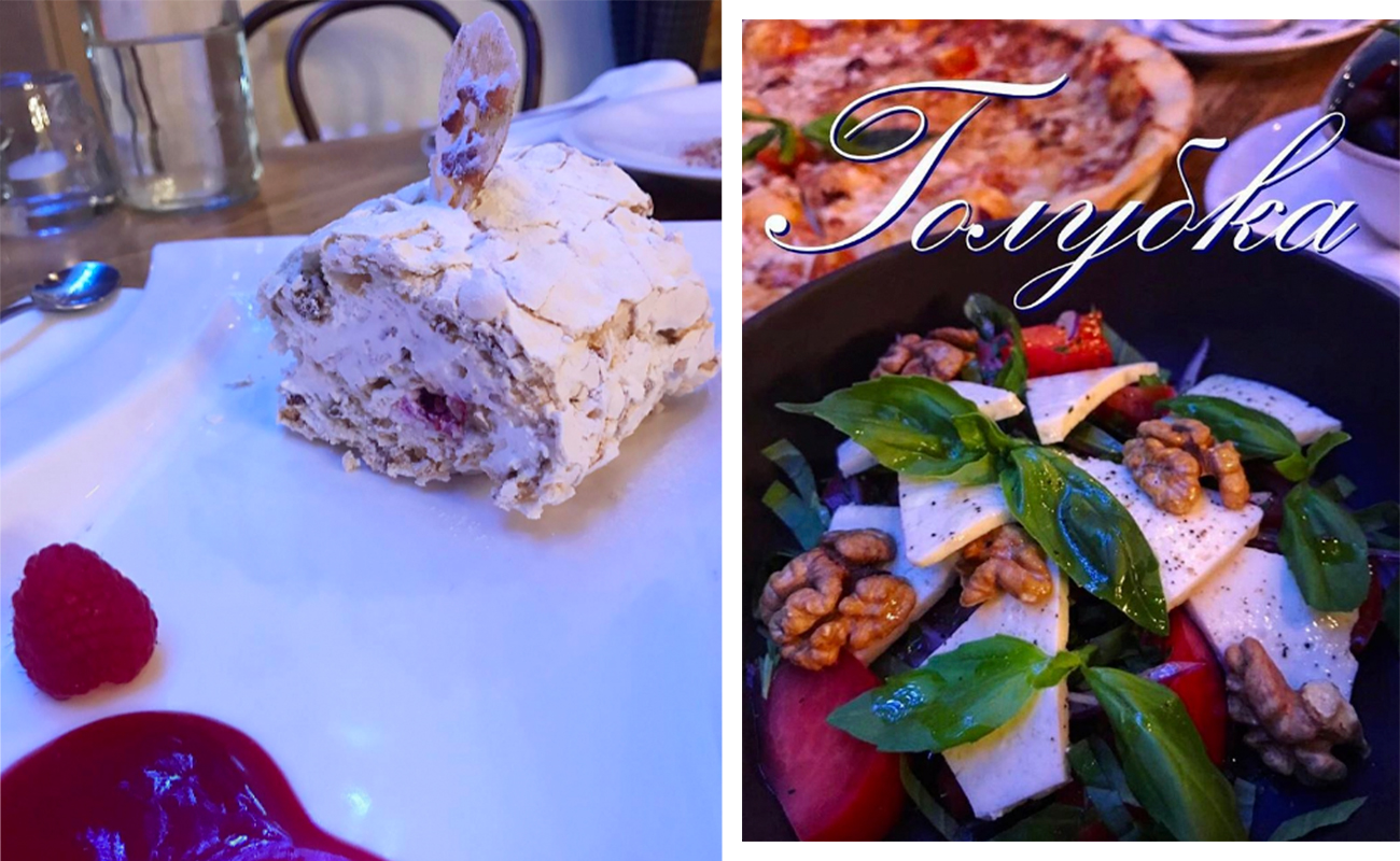 «Рулет меренговый с малиной» (450 р.) можно испробовать в ресторане «Голубка». Он явно предназначен для тех, кто намерен подсластить свою и без того сладкую жизнь! Сочетание хрустящего безе, нежных взбитых сливок и плотных орешков пришлось нам по вкусу. Приторную сладость смягчает изящная кислинка малинового варенья. Порция нереальная. Мы еле-еле справились вдвоем! Вот бы всегда так, да?