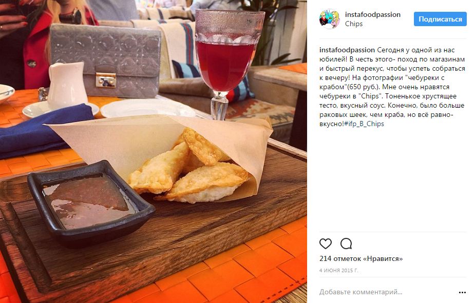 Chips – годы идут, а мы возвращаемся туда снова и снова, но преимущественно в летний сезон, зимой тут мрачновато. Как только открывается веранда, мы уже сидим с кальяном в одной руке и хачапури по-аджарски (370 р.) – в другой. Ничего нового мы не ждем, зато точно знаем, что обед окажется вкусным. Наши любимчики – это «Мини-чебуреки с крабом и сладкой креветкой» (490 р.), спагетти «Алио-Олио» с красным перцем (390 р.), куриные котлетки (440 р.) и многочисленные блюда на мангале.