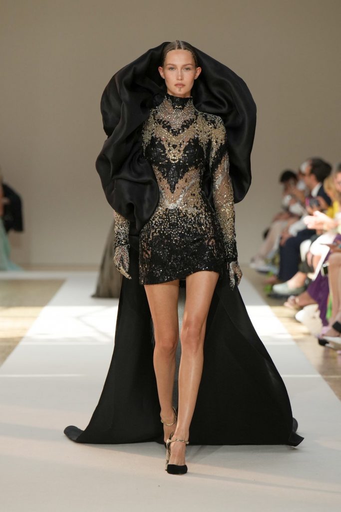 Сегодняшний показ Эли посвятил мгновенью «когда закатное солнце падает на море и преображает его цвета». В атмосфере шоу как будто чувствовалось что-то шаманское: недаром мы видим так много этнических мотивов – от объемных мужских накидок до украшений под губой. К слову, для истории бренда этот день стал знаменательным благодаря еще одному событию – дебютному запуску кутюрной линии для мужчин. «Я чувствую, что мужчины хотят показать себя. Еще до пандемии у них, как и у женщин, было желание эмансипироваться и проявить себя. Мужская утонченность становится все более популярной на рынке», – признается Сааб. Отдельные лавры – образу с мужскими перьями как своеобразному тотему.
