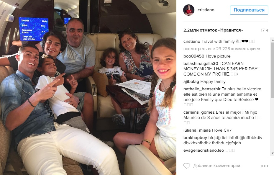 В частном самолете поместились все: мама Мария, брат Угу (41), сестры Эльма (42) и Лилиана (40), племянники, сын Криштиану-младший (6) и дядя. Роналду выложил фото счастливого семейства в Instagram с подписью: «Путешествие с семьей».