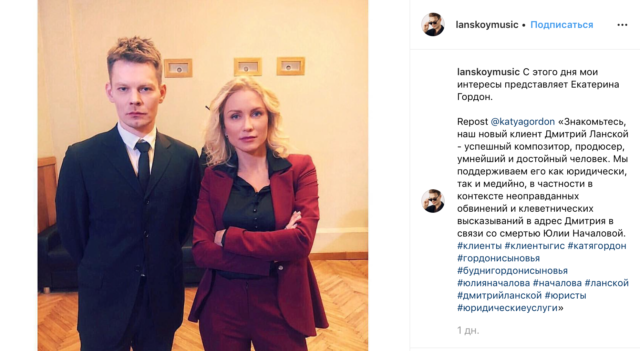 «Знакомьтесь, наш новый клиент Дмитрий Ланской — успешный композитор, продюсер, умнейший и достойный человек. Мы поддерживаем его как юридически, так и медийно, в частности в контексте неоправданных обвинений и клеветнических высказываний в адрес Дмитрия в связи со смертью Юлии Началовой», — написала адвокат в Instagram.
