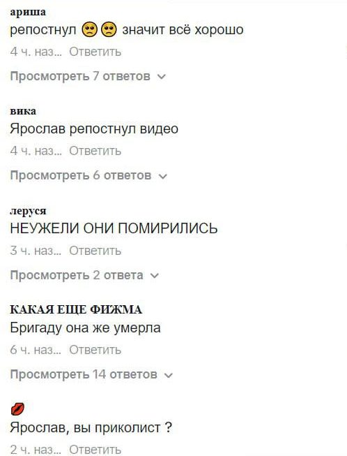 17-летний Могильников также подогрел интерес к их отношениям, сделав репост видео Ани. Это не осталось незамеченным пользователями соцсетей, которые начали активно обсуждать, не помирились ли они. Комментарии варьировались от шутливых до искренних: «Репостнул, значит все хорошо», «Неужели они помирились?», «Ярослав, вы приколист».