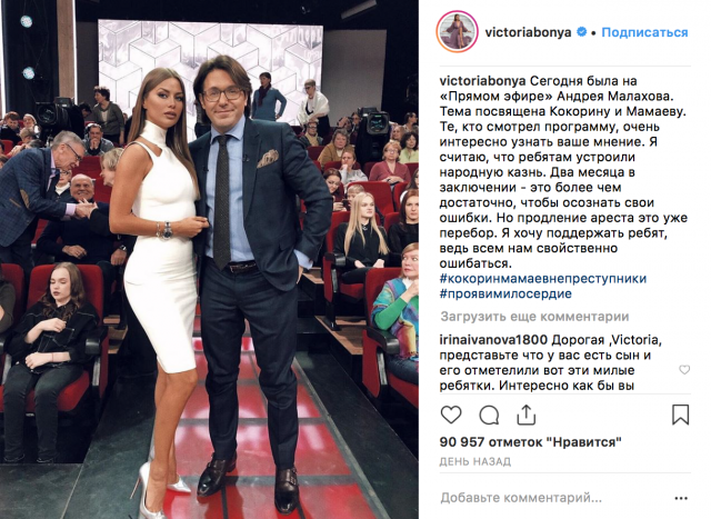 На защиту футболистов в программе «Прямой эфир» встали Виктория Боня и Ольга Бузова. «Сейчас миллионы зрителей смотрят эфир и видят картинку, где ребята избивают. Но почему нам не показывают картинку, как водитель говорит: «Слышь ты, петух! Я тебя не повезу!» А если бы он это сказал кавказцу любому? Его бы просто лишили головы, и никто не завел бы никакого уголовного дела. Во-вторых, в ресторане сидят Пак, девчонки с ребятами. Неважно, стриптизерши или нет, какая вообще разница! И их называют ***», — прокомментировала случившееся Боня. «Мне было жалко ребят. Попутал их змей или еще кто-то. Кокорина Сашку я очень хорошо знаю. Я знаю его с другой стороны. Он очень добрый, порядочный, искренний. Он еще молодой и где-то еще глупый парень. И когда в такую ситуацию попадают не только они, но и их семьи, на которые обрушилось столько злости от людей, страдают жены, матери. Когда я вижу слезы матери, мне плохо становится. Конечно, какое-то наказание должно быть, чтобы такое не поощрялось. Но разговоры о том, чтобы лишить их карьеры… Лишить карьеры футболиста – это как отрезать мне язык», — поделилась Бузова.
