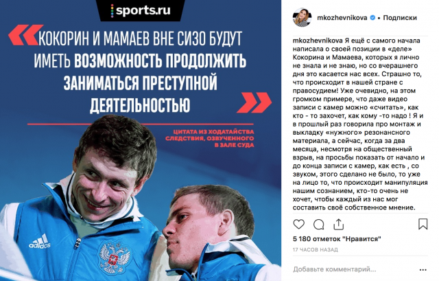 В движении приняли участие и звезды российского шоу-бизнеса. Мария Кожевникова (34), например, написала в своем аккаунте: «Я ещё с самого начала написала о своей позиции в «деле» Кокорина и Мамаева, которых я лично не знала и не знаю, но со вчерашнего дня это касается нас всех. Страшно то, что происходит в нашей стране с правосудием! Уже очевидно, на этом громком примере, что даже видео записи с камер можно «считать», как кто-то захочет, как кому -то надо! Я и в прошлый раз говорила про монтаж и выкладку «нужного» резонансного материала, а сейчас, когда за два месяца, несмотря на общественный взрыв, на просьбы показать от начало и до конца записи с камер, как есть, со звуком, этого сделано не было, то уже на лицо то, что происходит манипуляция нашим сознанием, кто-то очень не хочет, чтобы каждый из нас мог составить своё собственное мнение. Согласитесь, если вас первого ударят, то большинство, особенно, если мы говорим о мужчинах, дадут сдачу. Поэтому, нам и не показывают, кто зачинщик, кто первый совершил удар и кто, и как оскорблял. Ведь «стадо» должно «просить крови» за двух «самых опасных» преступников и забыть про всю несправедливость, которая происходит в действительности в нашей стране. Классно, пока опасные преступники, убийцы гуляют по улице, или кушают в тюрьме раков и икру, чиновники воруют, за наш счёт будут жить «жестокие, циничные и опасные» по мнению следствия, преступники Кокорин и Мамаев, которые очевидно сбегут от своих заоблачных контрактов, без паспортов, ну, наверное, метров 100, но если быстро бежать, то на 200 от стадиона. Никто, ни один человек, в том числе и главные герои, не отрицают вины, и готовы нести наказание именно за содеянное, но почему почти два десятка следователей при наличии видео, расследуют так долго 2 бытовые драки, которые совершаются десятки если не сотни в день в нашей стране. В таком случае, сколько же расследуются остальные дела и сколько должно быть тюрем, при такой порочной практике? И как же быть обычным людям, если у нас такая «машина» по уничтожению «работает»? P.S. Я присоединяюсь к движению #СашаМыСТобой, не зная Сашу и остальных ребят, так как настаиваю на справедливости, прозрачности, а главное, что любое наказание должно быть пропорционально преступлению» (Орфография и пунктуация автора сохранены — Прим. ред.).