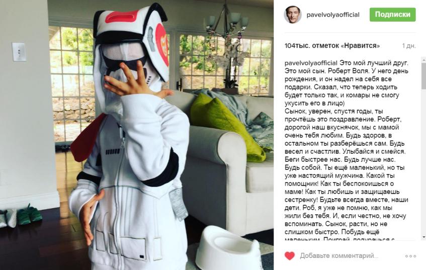 На фото, которое появилось в соцсети юмориста 15 мая, Павел действительно запечатлел сына Роберта, которому, к слову, 15 мая исполнилось 3 года. Однако из-за яркого костюма поклонники не смогли увидеть лицо мальчика. Зато под снимком гордый отец оставил трогательное поздравление: «Это мой лучший друг. Это мой сын. Роберт Воля. У него день рождения, и он надел на себя все подарки. Сказал, что теперь ходить будет только так, и комары не смогу укусить его в лицо) Сынок, уверен, спустя годы ты прочтешь это поздравление. Роберт, дорогой наш вкуснячок, мы с мамой очень тебя любим. Будь здоров, в остальном ты разберешься сам. Будь весел и счастлив. Улыбайся и смейся. Беги быстрее нас. Будь лучше нас. Будь собой. Ты еще маленький, но ты уже настоящий мужчина. Какой ты помощник! Как ты беспокоишься о маме! Как ты любишь и защищаешь сестренку! Будьте всегда вместе, наши дети. Роб, я уже не помню, как мы жили без тебя. И, если честно, не хочу вспоминать. Сынок, расти, но не слишком быстро. Побудь еще маленьким. Поиграй, подурачься с нами, так и к нам возвращается детство. Спасибо тебе за эти три счастливых года!!!»