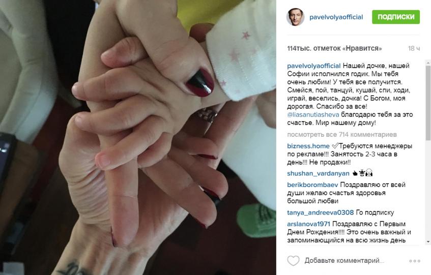 «Нашей дочке, нашей Софии исполнился годик. Мы тебя очень любим! У тебя все получится. Смейся, пой, танцуй, кушай, спи, ходи, играй, веселись, дочка! С Богом, моя дорогая. Спасибо за все! @ЛяйсанУтяшева благодарю тебя за это счастье. Мир нашему дому!» — подписал резидент Comedy Club фотографию, на которой запечатлены три руки: самого Павла, его супруги Ляйсан (30) и маленькой именинницы.