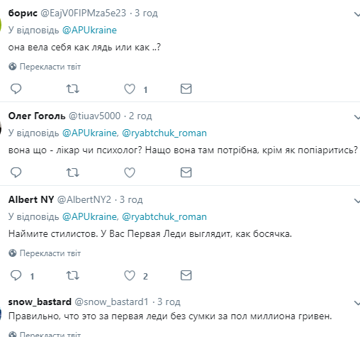В Сети тут же начали активно обсуждать внешний вид первой леди: мол, выглядит она и ведет себя неподобающе. «Надо учиться вести себя посдержаннее. Не на корпоратив «Квартала 95» заехала», «Она что – врач или психолог? Зачем она там нужна, кроме как попиариться?», «Наймите стилистов. У вас первая леди выглядит как босячка», – возмутились подписчики.