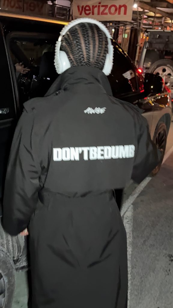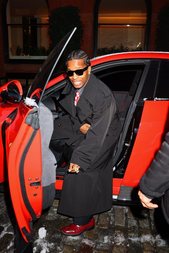 Вместе с Рианной появился и A$AP Rocky в черном тренче, на спине которого красовалось название его нового альбома Don’t Be Dumb – долгожданного проекта, который рэпер выпустил 16 января 2026 года после восьмилетнего перерыва между студийными работами.