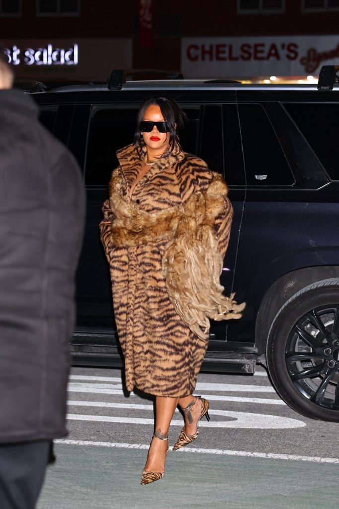 Рианна привлекла внимание папарацци своим тотал-тигриным луком Alaïa, выбрав шерстяную шубу стоимостью 7 050 долларов и такие же тигриные туфли бренда за 1 850 долларов. Образ она дополнила меховым шарфом, использованным исключительно в качестве аксессуара, а также черными солнцезащитными очками. И, конечно, дива не была бы собой, если бы не появилась с ярко-красной помадой на губах и обилием бриллиантов на шее. Стоит отметить, что Рианна – одна из немногих, кому идут абсолютно любые шубы, которые она может позволить себе носить на голое тело.